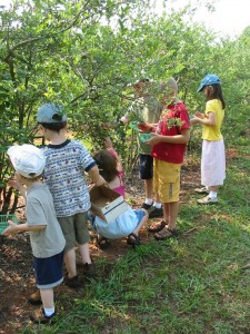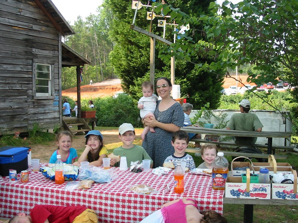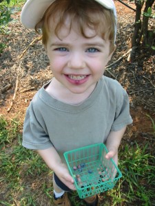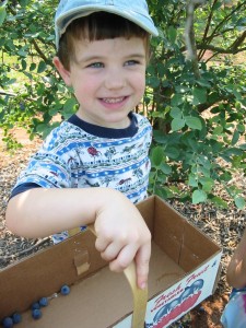 What a wonderful week this has been! On Monday, my dear friend “P” (I haven’t asked her if I could use her name on my blog yet) took us blueberry picking. The kids were amazed at the rows upon rows of bushes FILLED with blueberries! I was quite proud of them — they did a great job filling up our box to take home, and they did ask before they sampled some of the harvest. (I had to explain the concept of the “sin bucket,” and the donation Mommy would be making to it to cover the cost of the blueberries that we ate while working).