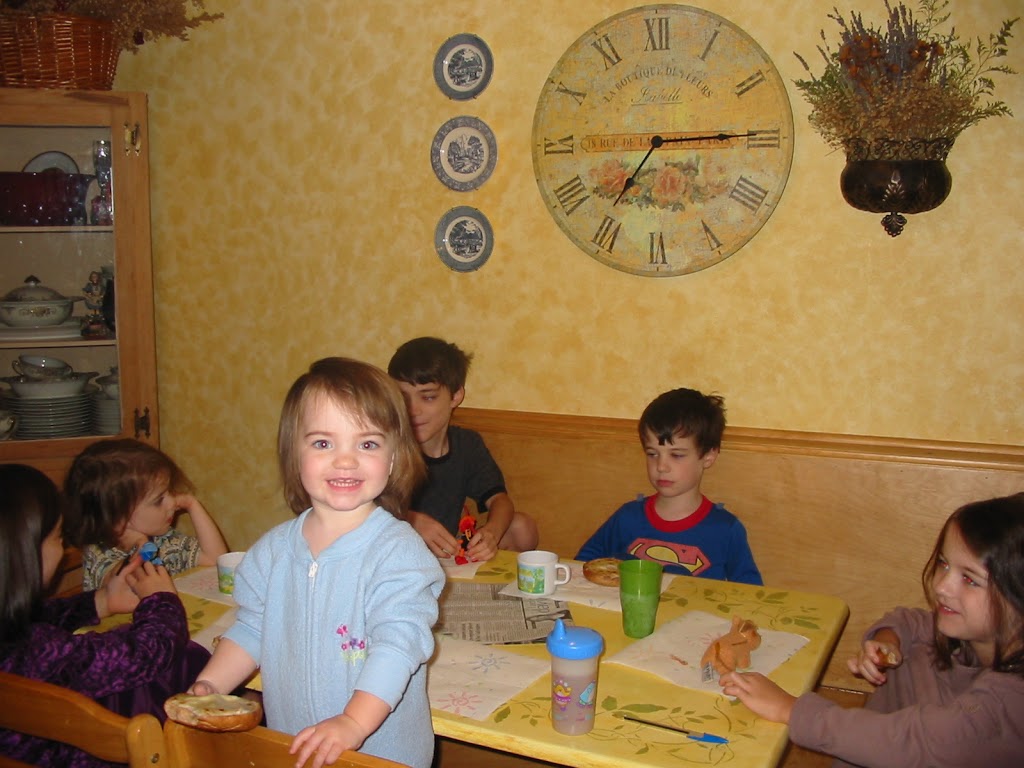 7:00 AM — Everyone is in the kitchen. We pray and start eating. We USED to read the readings to the kids at this time, but we’ve gotten out of the habit (hang head in shame).