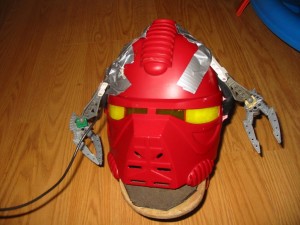 This is how we make robots — talking helmet, bionicle pieces, skateboard, and lots of duct tape (I think this is rather ingenious for a 5-yr old!)