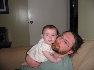 My dh got the chicken hat as a joke — I think it was a promotional item for the CHICKEN LITTLE movie — and it quickly became Marie’s hat of choice. She *insists* on wearing the hat whenever it’s cold out.