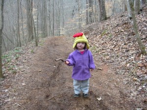 This is how we hike through the woods. Chicken hat IS a necessity.