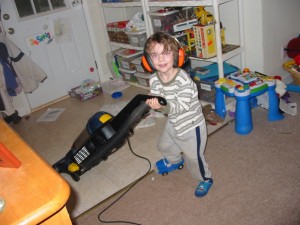 This is how we vacuum — ear muffs, feet protectors (matching not necessary), running full tilt through the playroom. [Don’t talk to me about how messy it all is. Believe me, my kids have heard quite a bit of ranting from me this weekend about the state of the house…]