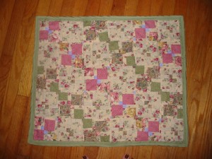 (I made a full-sized one before, but I cheated and just used the fat quarters from the fabric store “as is” — that is, I didn’t cut them up into any interesting shapes or designs. Just slapped squares together and appliqued autumn leaves all over it. It’s my husband’s favorite quilt, but I digress….)