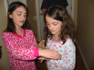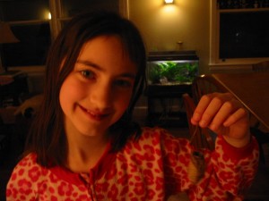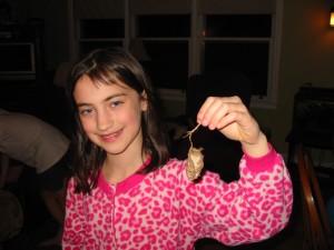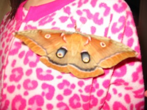 I wasn’t able to get a picture of it, but Marie was able to hold her friend (a polyphemus moth) — briefly — before we let him sail out into the night air.